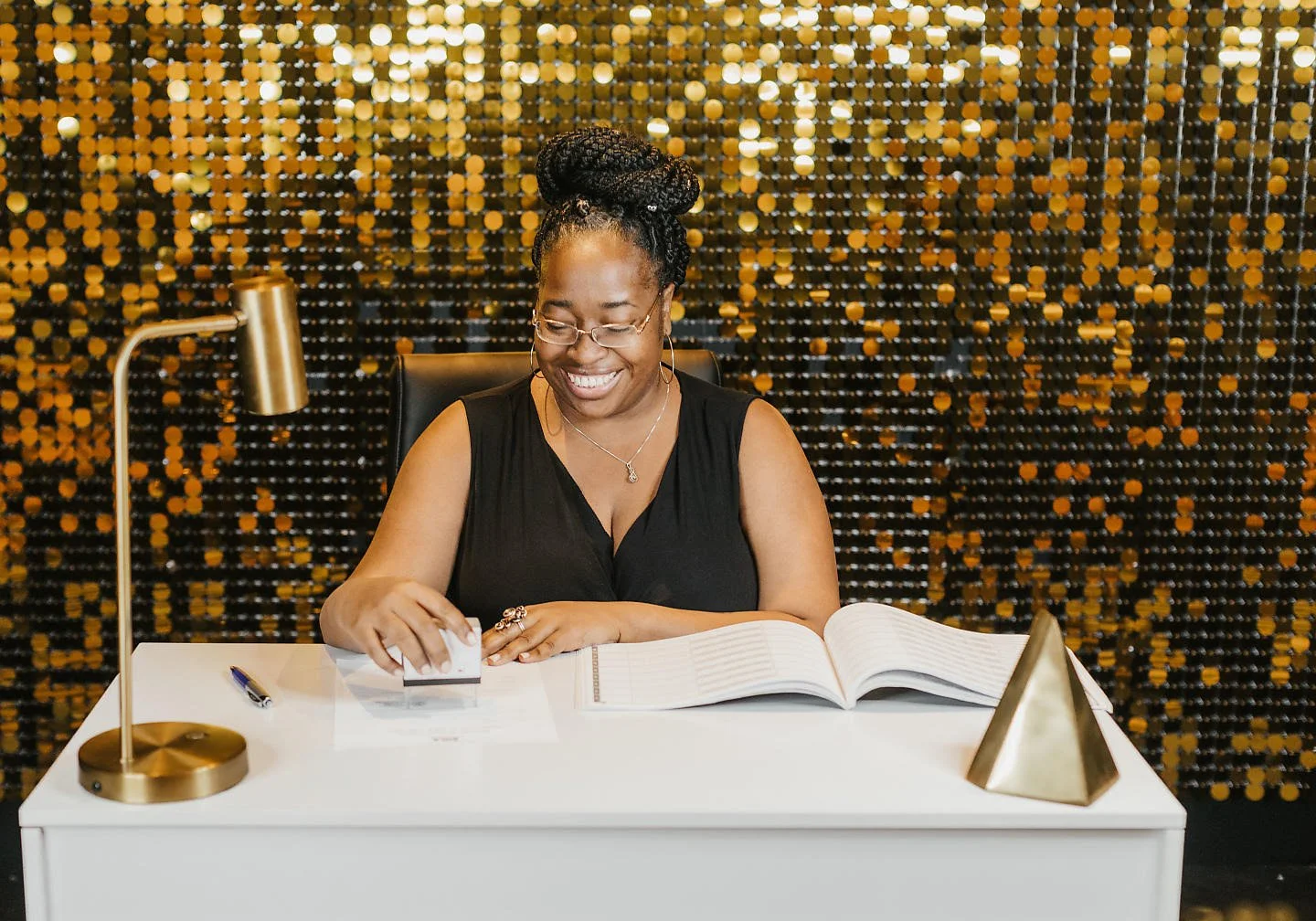 Pamala Brooks, “Notary Babe”, Las Vegas, NV, “I asked my friend to help me take a few promotional photos to market my notary business, and this is how they turned out. I didn't have much money, so we went to Selfie World in Vegas to take the pictures using their props and selfie equipment. The notary stamp and notary book are real. I am a Notary in real life 🤓.”